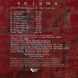 Charles Lester Music proudly announces the release of Enigma. Enigma is a new recording by two of the foremost leading innovators in creative music today, pianist and multi-instrumentalist Joel Futterman and multi-reed player Ike Levin. This CD represents another in an expanding series of documented collaborations between these two highly skilled and adventurous improvisers. Musical ideas launch with soaring expansions and flow with fire and ecstatic energy. More abstract musical forms and ideas morph back and forth between rich harmonic undercurrents and melodic overlays. Levin testifies with scorching bellows and cries and angular lines over the churning and evolving torrents laid down on the piano by Futterman. Yet, even the at the heights of abstractness and expressiveness their music swings with conviction. These two musicians clearly share a common vision and strong intuitive connection that is evident in the richness and variations in their music. The Village Voice has referred to Futterman and Levin as two "highly committed creative artists who do not compromise their art."